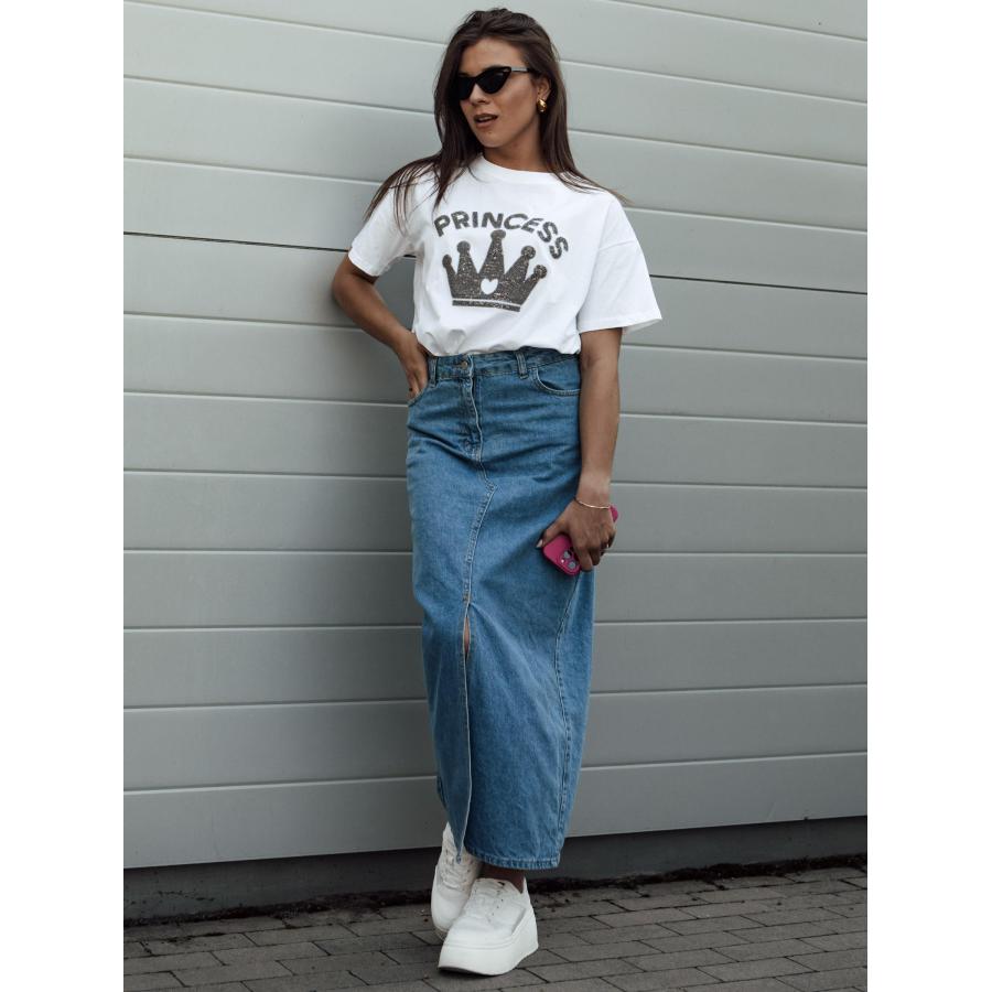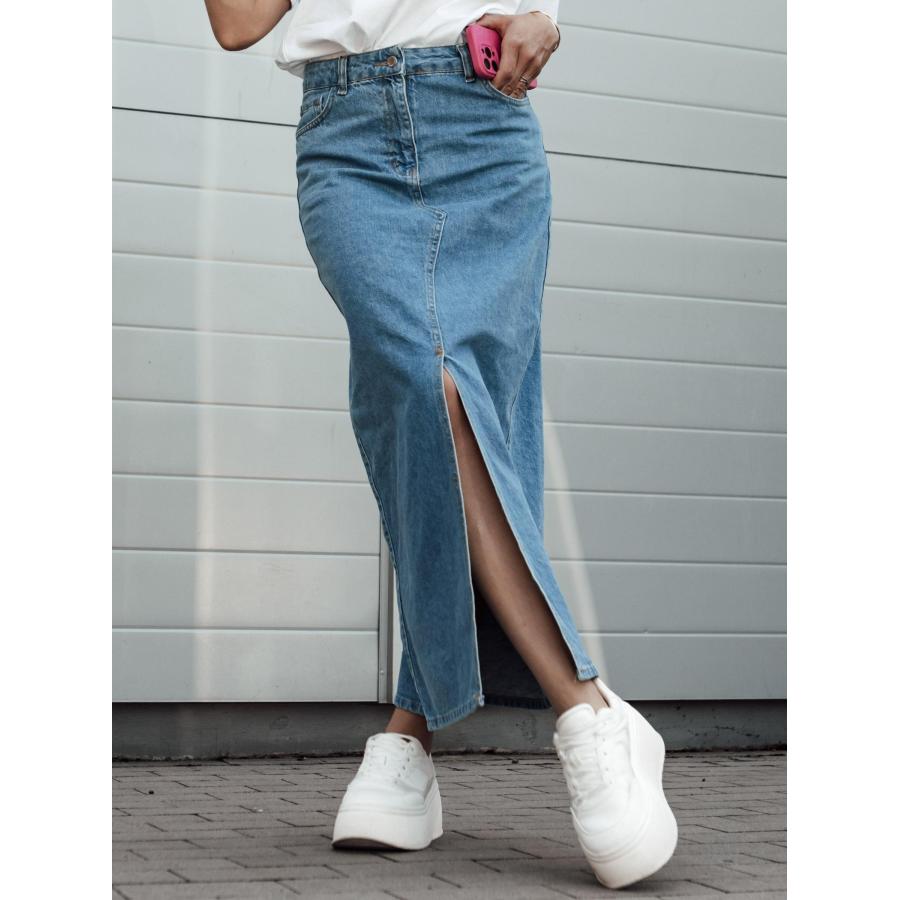 Női farmer maxi szoknya kék színben, hasítékkal, kiváló minőségű anyagból, a legújabb divattrendek szerint tervezve.